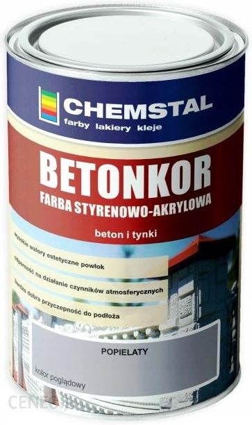 CHEMSTAL BETONKOR- FARBA DO BETONU I POSADZEKAZASTOSOWANIE:Farba przeznaczona jest do ochrony betonu i innych elementów cementowo-betonowych w tym również betonu zbrojonego, któremu zapewnia dodatkową ochronę przed dostępem korozji. Doskonale nadaje się do malowania ogrodzeń betonowych i posadzek.CHARAKTERYSTYKA:BETONKOR jest farbą styrenowo-akrylową, tworzącą powłoki półprzepuszczalne tzn. nieprzepuszczające wody, dwutlenku węgla i tlenu w głąb betonu, pozwalając jednocześnie mu „oddychać”. Może być stosowany w temperaturach ujemnych na suchych powierzchniach.WŁAŚCIWOŚCI:1. Czas schnięcia powłoki w temp. 20 ºC i wilgot. wzgl. pow. 65 %. – 4 st. – 1,5 h – 6 st.. -10 h2.Wygląd powłoki – równa, gładka3. Gęstość (g/cm³) , najwyżej -1,25 WYDAJNOŚĆ: do 7 m²/lOPAKOWANIA: 1L, 5L, 10L, 20LWSKAZÓWKI: Chronić przed dziećmi.W czasie prac malarskich i po ich zakończeniu pomieszczenia należy intensywnie wywietrzyć do zaniku zapachu i po tym czasie nadają się do użytkowania.WYDAJNOŚĆ: do 7 m²/lORES GWARANCJI: 24 miesiące