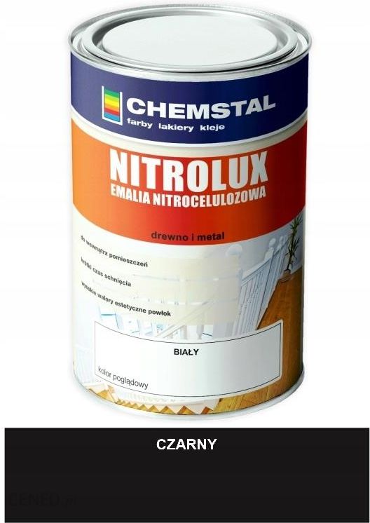 CHEMSTAL NITROLUX EMALIA NITROCELUKOZOWA 1LNITROLUX produkowany jest na bazie roztworu nitrocelulozy, żywicy alkidowej, pigmentów oraz dodatków w rozpuszczalnikach organicznych. Powłoki charakteryzują się krótkim czasem schnięcia, wysokim połyskiem, bardzo dobrą rozlewnością, jednorodnością wymalowań. Do stosowania wewnątrz pomieszczeń. Przeznaczony jest do przemysłowego malowania przedmiotów drewnianych, płyt wiórowych, płyt meblarskich z naturalną okleiną drewna i sklejek, elementów wyposażenia wnętrz oraz elementów metalowych uprzednio zagruntowanych farbą antykorozyjną.Wydajność: 10 m2 z 1LKolor: czarny połyskSPOSÓB STOSOWANIA:Przed użyciem emalię należy dokładnie wymieszać, do momentu uzyskania jednorodnej mieszaniny. Powierzchnie przeznaczone do malowania powinny być suche, czyste, wyszlifowane i odpylone, wolne od żywicznych plam ( drewno), zabezpieczone antykorozyjnie (metal). Stare powłoki przeszlifować ( w sytuacji gdy są dobrze związane z podłożem) lub usunąć w całości ( w przypadku luźnych powłok). W celu zmniejszenia zużycia farby oraz wyrównania powłoki drewna zaleca się stosowanie farby podkładowej NITROLUX PODKŁAD. Nanosić pędzlem, natryskiem, wałkiem rozcieńczając emalię do lepkości roboczej rozcieńczalnikiem do wyrobów nitrocelulozowych (zaleca się stosowanie rozpuszczalnika NITRO produkcji F.F.L.i K. „CHEMSTAL” Sp. z o.o.) – max. do 10% lub przez zanurzenie ( przy tej metodzie należy skonsultować się z producentem). Wymalowania wykonywać w temperaturze powyżej 15C oraz wilgotności względnej poniżej 80%. W celu uzyskania najlepszych efektów dekoracyjnych i ochronnych zaleca się nakładanie 2-3 warstw emalii (zaleca się szlifowanie międzywarstwowe).Produkt posiada atest higieniczny.
